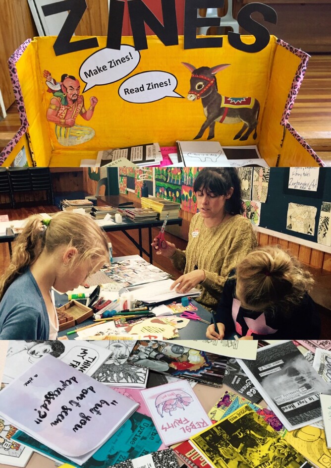 After the exhilaration of Scary Music, we wandered over to the Featherston school, peeked into the hall, stepped through a forest of paper chains and into the magical workshop on "Zines" (pronounced Zeenes) with the fabulous and multi talented Murtle Chickpea! It was somewhat like stepping through the looking glass and into wonderland....we were captivated from the word go. Meeting Murtle and making our first ever Zines was another highlight of Booktown, Zines are an AMAZING form of creative expression and Murtle is passionate about teaching this skill to anyone and everyone who arrives. We soon joined in and sat at the table surrounded by every collage material you could imagine and set about making our Zines.