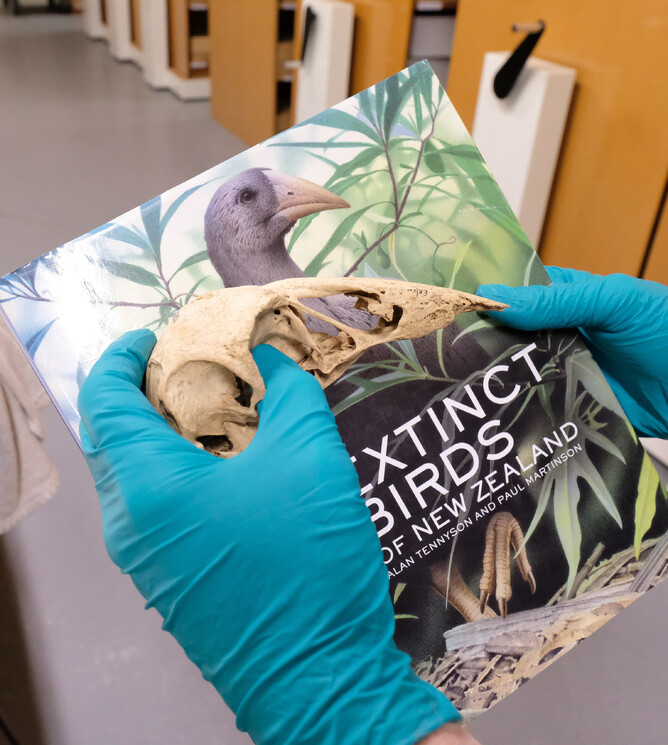 Photo above: ⇣ Curator Alan Tennyson holds an adzebill skull next to a painting of the extinct bird on his book ‘Extinct Birds of New Zealand’, published 2007. Te Papa