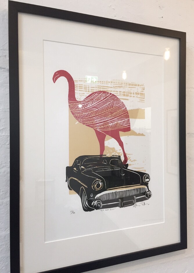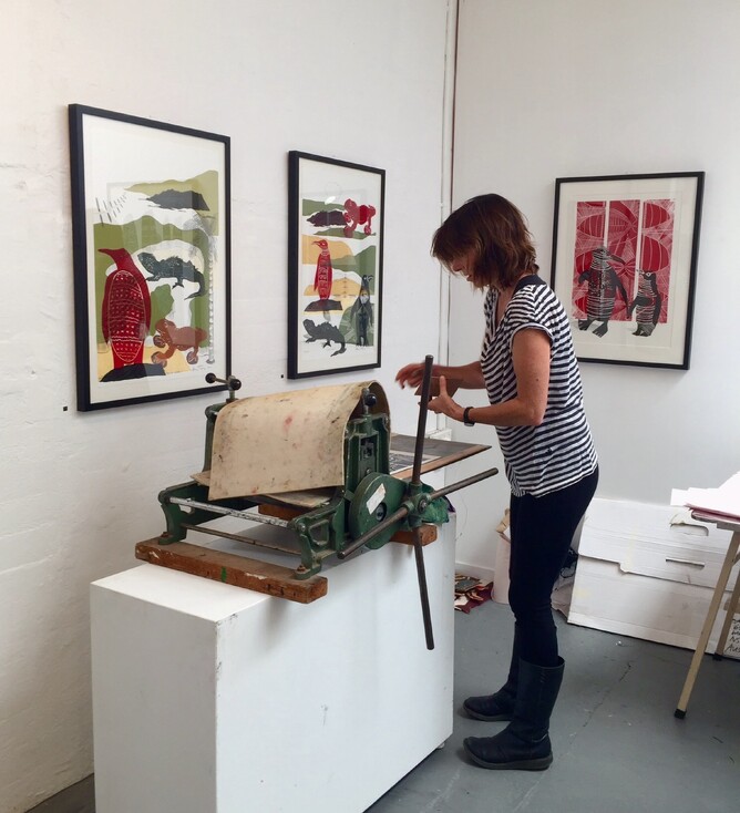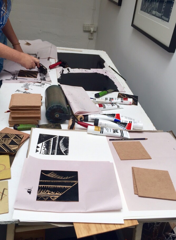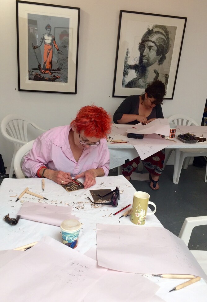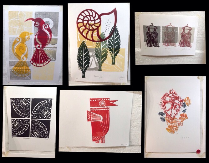 Two days of total immersion in a block printing workshop with one of New Zealands renowned artists sounds like creative heaven to us. Visiting the workshop & seeing the collective artists in action was evidence of this. The workshop was clearly a well organised creative space with no moment of each 6 hour session over the two days wasted - this group were seriously industrious with creative flow filling the room like a tidal wave. Nothing was going to slow down or stop this creative train. The lino cutting, chisels, the printing press, ink, art materials scattered on work tables & stunning works of art all took us back in time to art rooms from yesteryear.